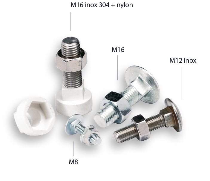 Viti M 8 zincate + dado flangiato (per raccordi SIL)Viti M 12 zincate + dado (per raccordi SL e SP < Ø76,1 mm)Viti M 16 zincate + dado (per raccordi SL e SP >= Ø76,1 mm)Bulloni Inox su richiesta.