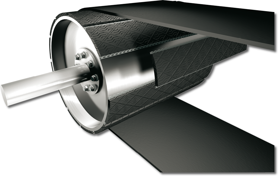 Copertura rapida della puleggia da effettuare in officina o direttamente sull’impianto grazie a barre già calandrate in gomma (durezza 70 Shore +- 5) antifiamma tipo FLAME STOP GRM2311 con supporto in acciaio Corten da inserire su guide in acciaio. Il profilo speciale della gomma aumenta sensibilmente il coefficiente d’attrito fra nastro e puleggia e fornisce un’azione autopulente della puleggia stessa.