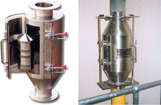 Le tubazioni magnetiche in alloggiamento sono ideali per la rimozione di frammenti (per es. dadi, bulloni, graffe, ecc.) trasportati pneumaticamente o con gravità. Questo modello è progettato per evitare che frammenti di metallo danneggino macchinari costosi come emulsionatori, granulatori, mescolatori e trasportatori a coclea. Un nucleo magnetico ad alta intensità è montato centralmente all’interno di un contenitore in acciaio inox. La struttura garantisce che il flusso di prodotto non venga alterato dall’elemento magnetico. Il nucleo contiene materiale magnetico in terre rare ad alta intensità che genera campi di flusso magnetico che garantiscono il recupero delle impurità mentre il terminale conico aiuta a mantenere l’integrità del flusso e del prodotto durante il processo. Possono essere trattate tutte le polveri e i granulati secchi. Sulle tubazioni magnetiche si possono montare interblocchi di sicurezza elettrici per bloccare il ciclo in caso di apertura accidentale.